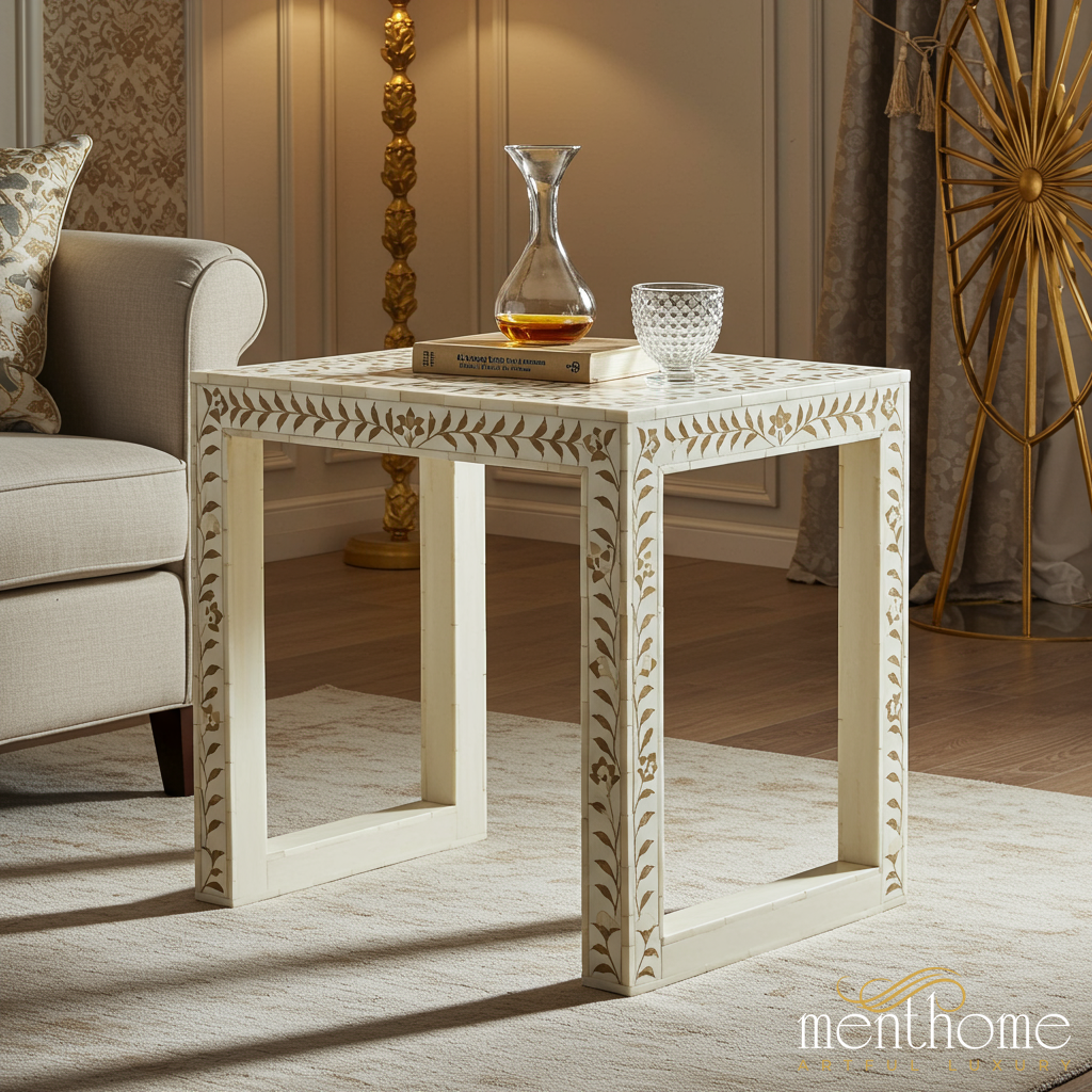 Elegant White and Gold Inlay Side Table | Luxury Handmade Side Table