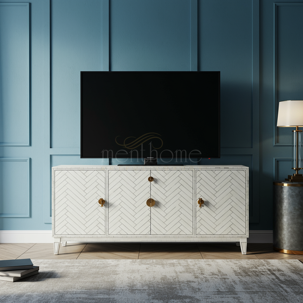 This exquisite inlay TV cabinet features a sophisticated herringbone pattern on its white finish, complemented by sleek brass hardware. Designed to elevate your living room, it combines aesthetic appeal with practical storage solutions for media essentials.