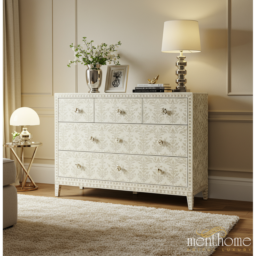 Elegant White Patterned Dresser with Brass Knobs | Luxury Handmade Dresser