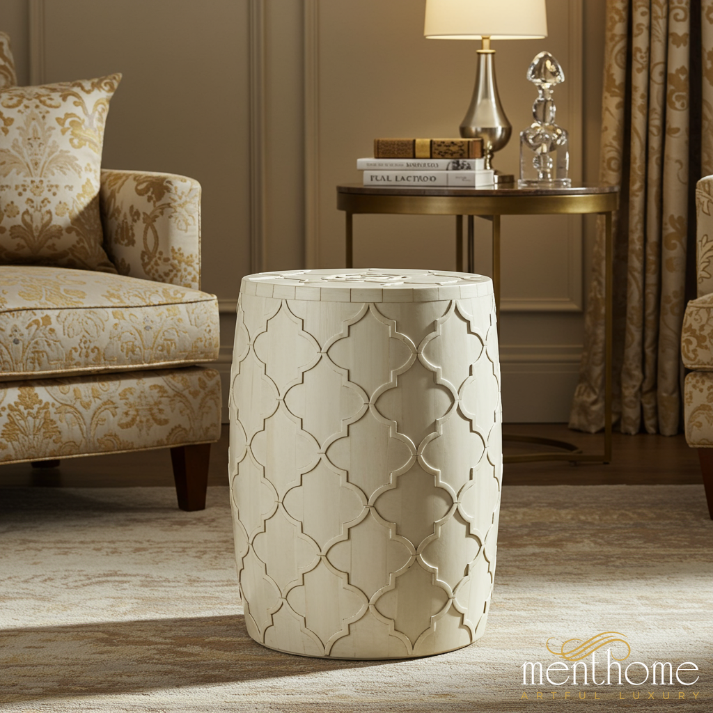 Elegant White Wooden Garden Stool with Lattice Design | Luxury Handmade Stool