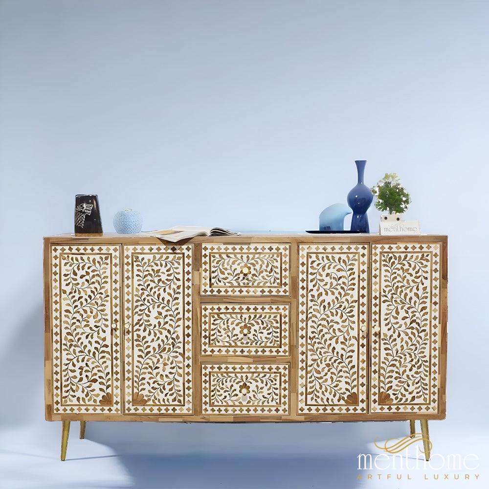Floral Pattern Wooden Inlay 4-door and 3 drawers cabinet | Luxury Handmade Cabinet