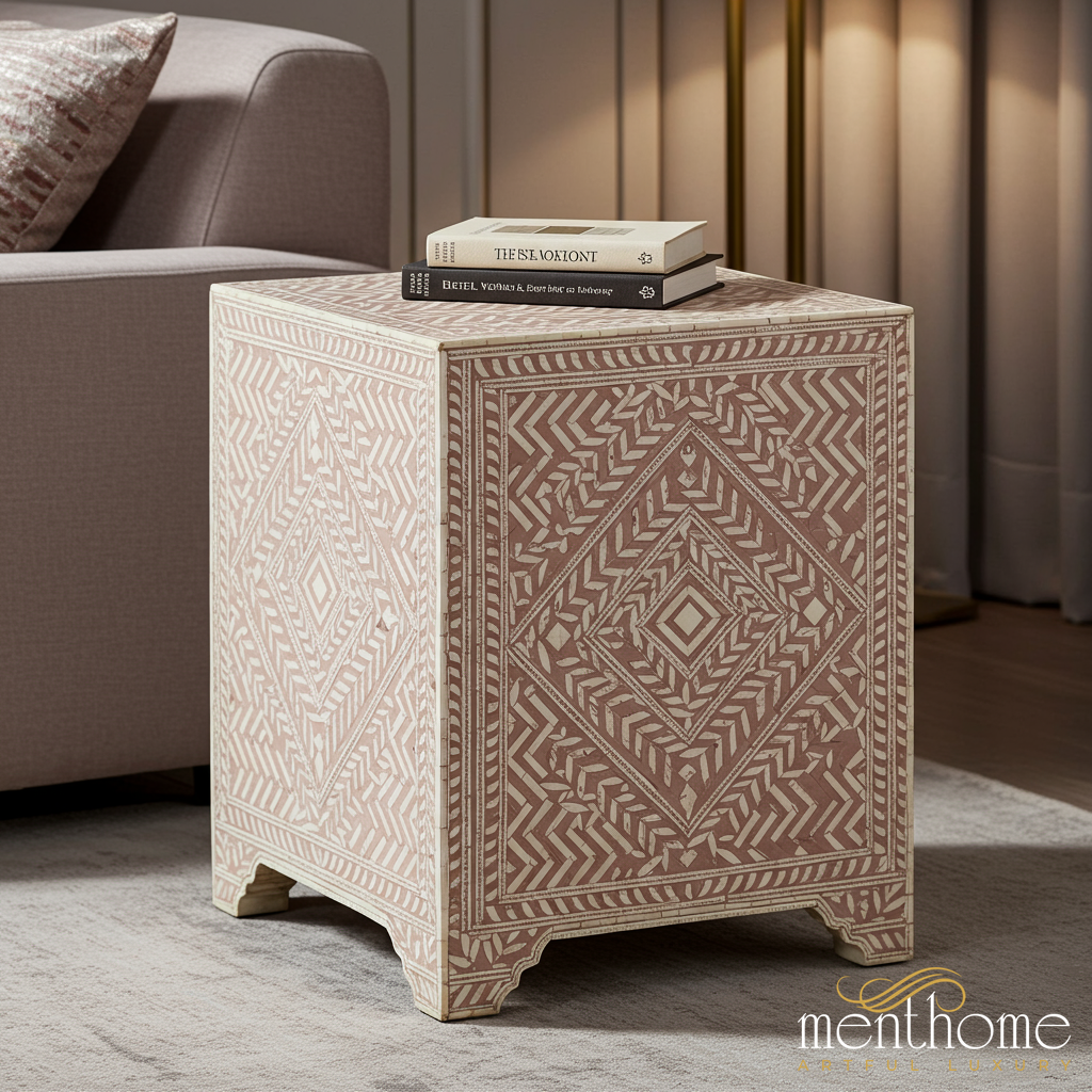Elegant and versatile, this side table features intricate geometric patterns etched on a sturdy wooden construction, perfect for adding a touch of sophistication to your home decor.