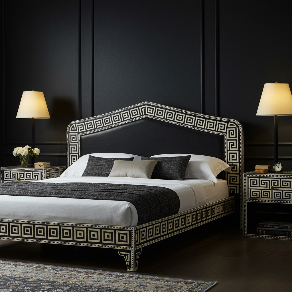 Greek Key Pattern Luxury King Bed with Matching Nightstands