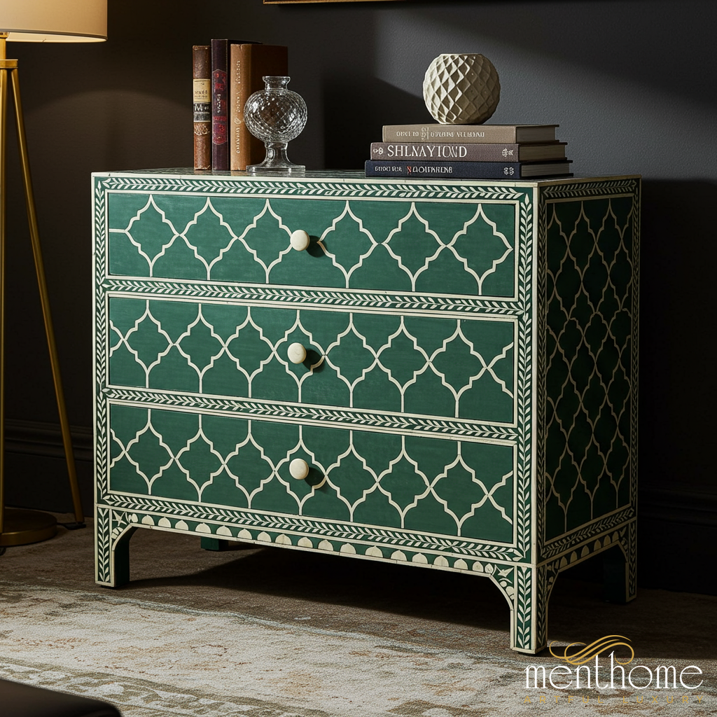 A stylish and functional chest of drawers featuring a green base with ivory patterned detailing. This chest offers ample storage with three spacious drawers, perfect for organizing clothes, linens, or other household items. Crafted with care, it combines traditional design with contemporary practicality.