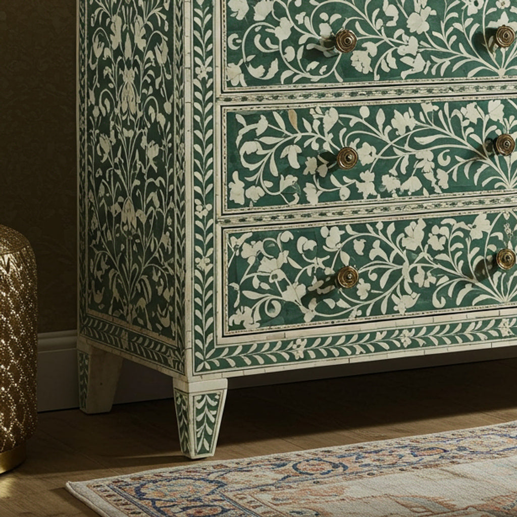 Green Floral Inlaid Wooden Chest of Drawers | Luxury Handmade Dresser
