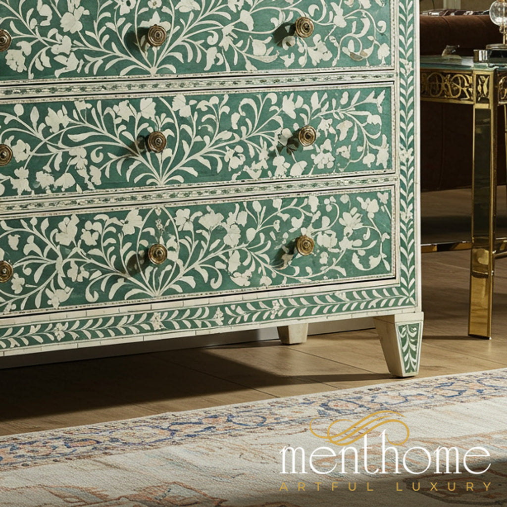 This exquisite chest of drawers features intricate white floral inlay on a green wooden frame. It is a stylish and functional addition to any room, offering ample storage with three spacious drawers and elegant brass knobs.