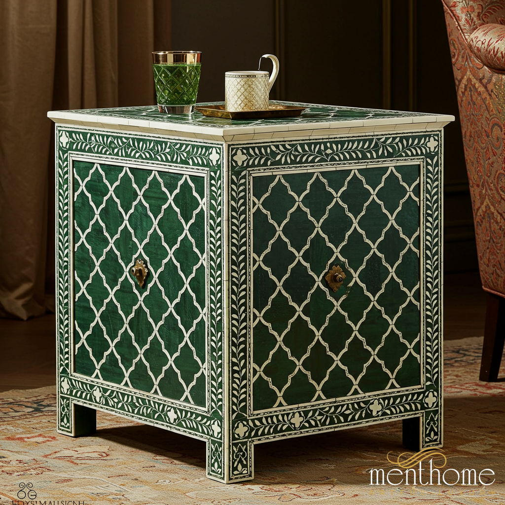 A beautifully crafted green side table featuring intricate white bone inlay work with floral and geometric patterns. This finely detailed piece adds an elegant touch to any living space, combining functionality with traditional artisanal design.