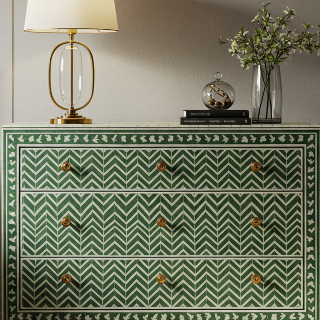 A stylish green chest of drawers featuring a bold herringbone pattern with cream accents. This piece combines functionality with decorative appeal, perfect for adding a touch of elegance to any bedroom or living space.