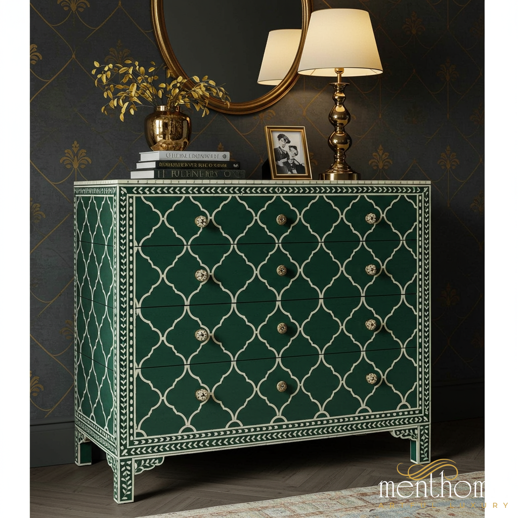 A beautifully designed wooden chest of drawers featuring an elegant green base color with intricate white geometric patterns. This piece combines classic craftsmanship with modern style, offering ample storage with multiple drawers and decorative brass knobs.