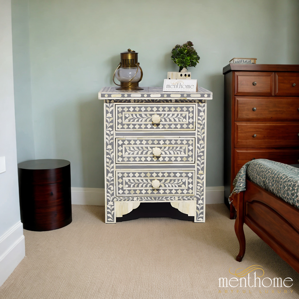 Grey Bedside Table adorned with a graceful Leaf Pattern | Luxury Handmade Bedside Table