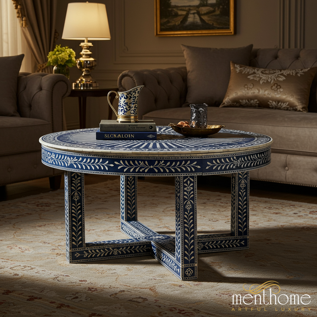 Hand-Painted Blue and White Round Coffee Table | Luxury Handmade Coffee Table