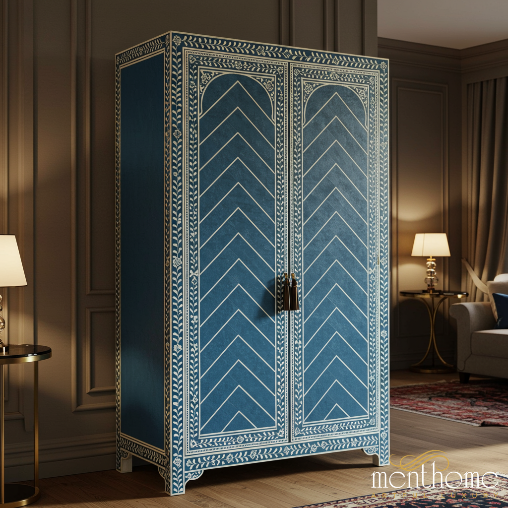 Hand-Painted Blue Chevron Wardrobe Cabinet | Luxury Handmade Wardrobe
