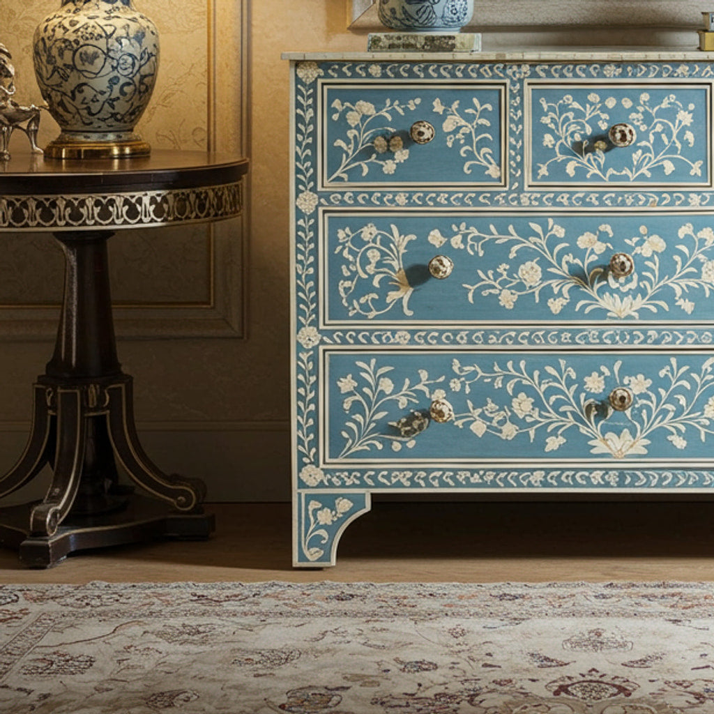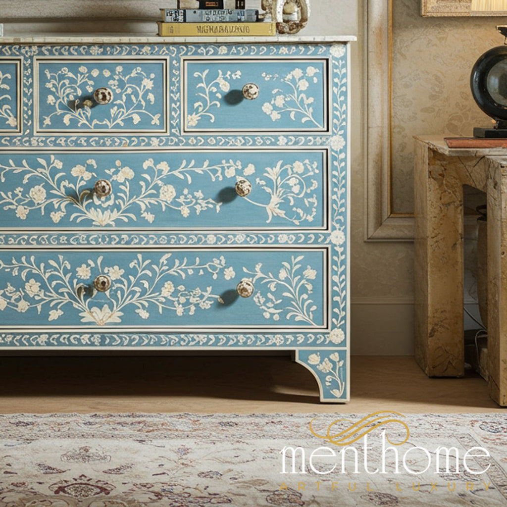 Elegant blue chest of drawers featuring intricate hand-painted white floral designs. This piece adds vintage charm and sophisticated storage to any living room or bedroom.