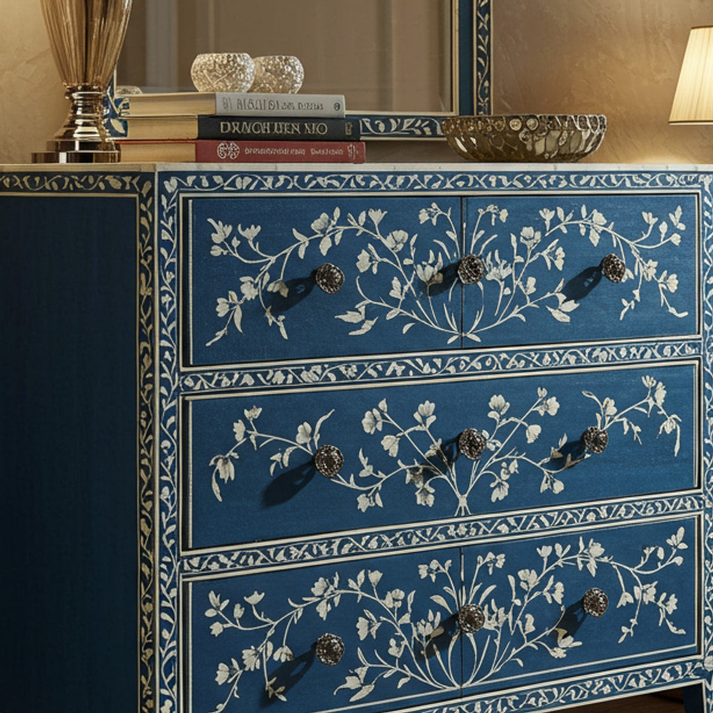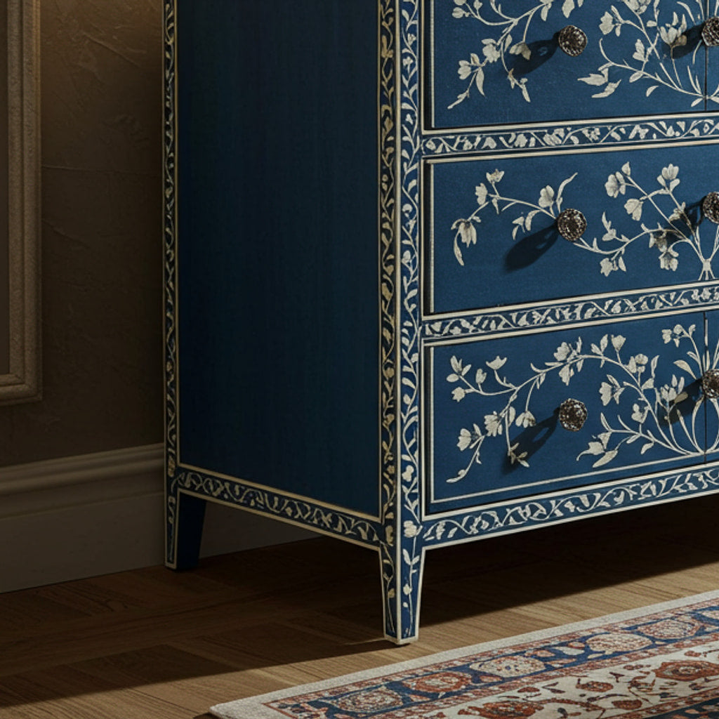 Hand-Painted Blue Floral Wooden Chest of Drawers | Luxury Handmade Dresser