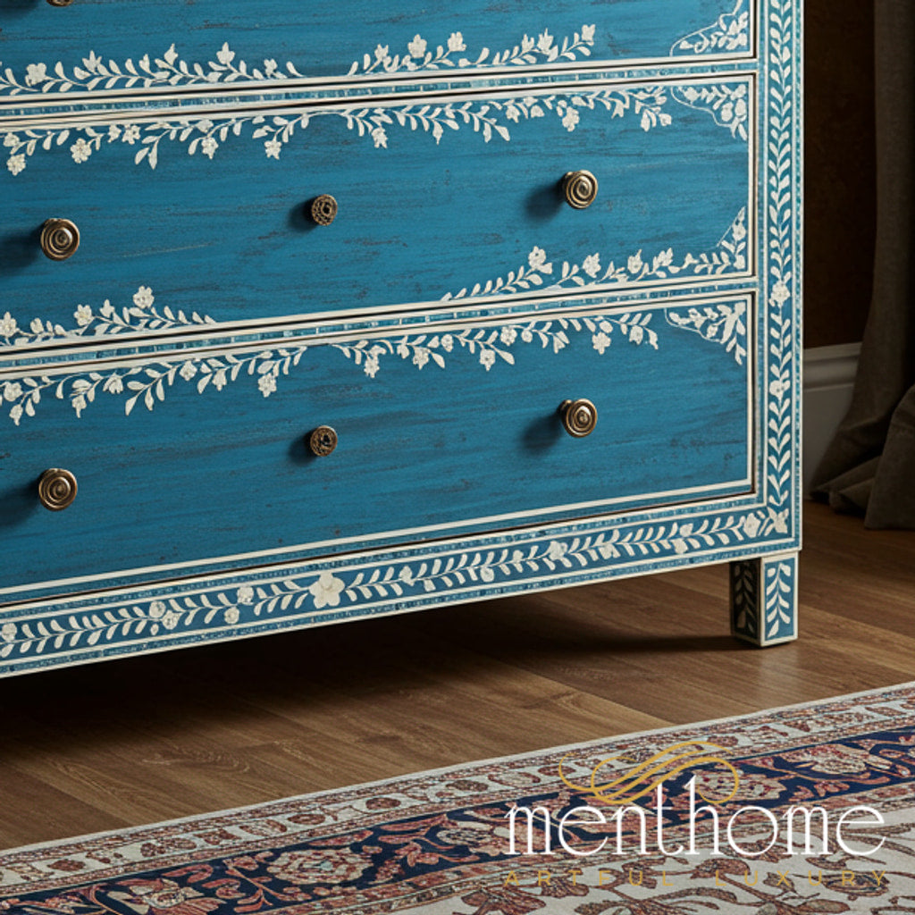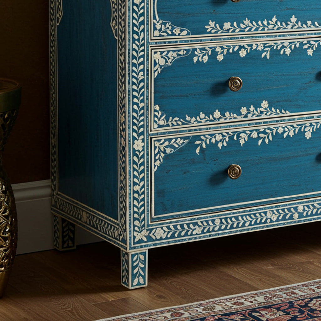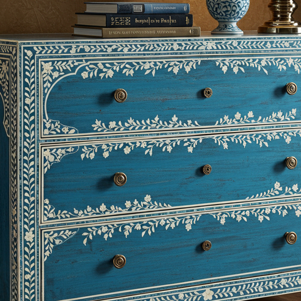 A stunning hand-painted wooden chest of drawers featuring intricate white floral patterns on a vibrant blue background. This piece combines traditional artistry with functional design, perfect for adding a touch of elegance and storage to any living space.