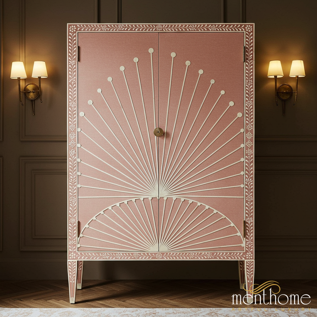 This exquisitely hand-painted wooden armoire features a unique sunburst design in soft pink and white hues. Crafted to combine style and functionality, it offers ample storage space while serving as an elegant accent piece for your living room, bedroom, or hallway.