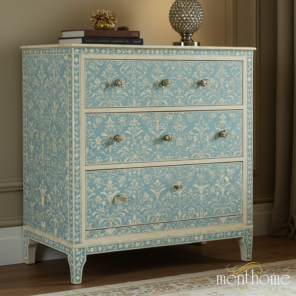 This elegant chest of drawers features a hand-painted floral pattern in soothing blue and cream tones, adding a touch of vintage charm to any room. Crafted with three spacious drawers and decorative knobs, it blends functionality with decorative appeal.