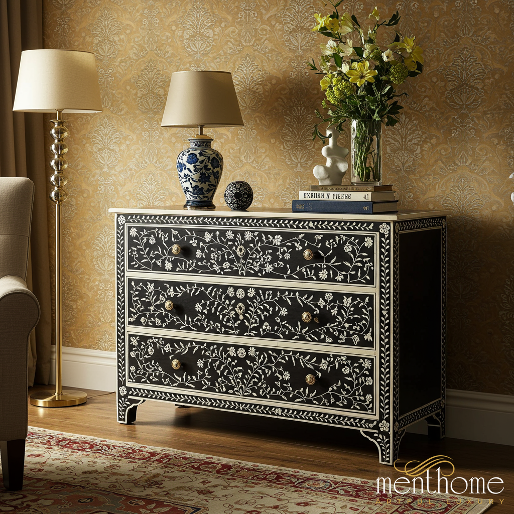 A striking hand-painted dresser chest featuring intricate floral bone inlay designs on a black backdrop. This elegant piece combines traditional artistry with functional storage, making it a perfect addition to any living room, bedroom, or hallway.