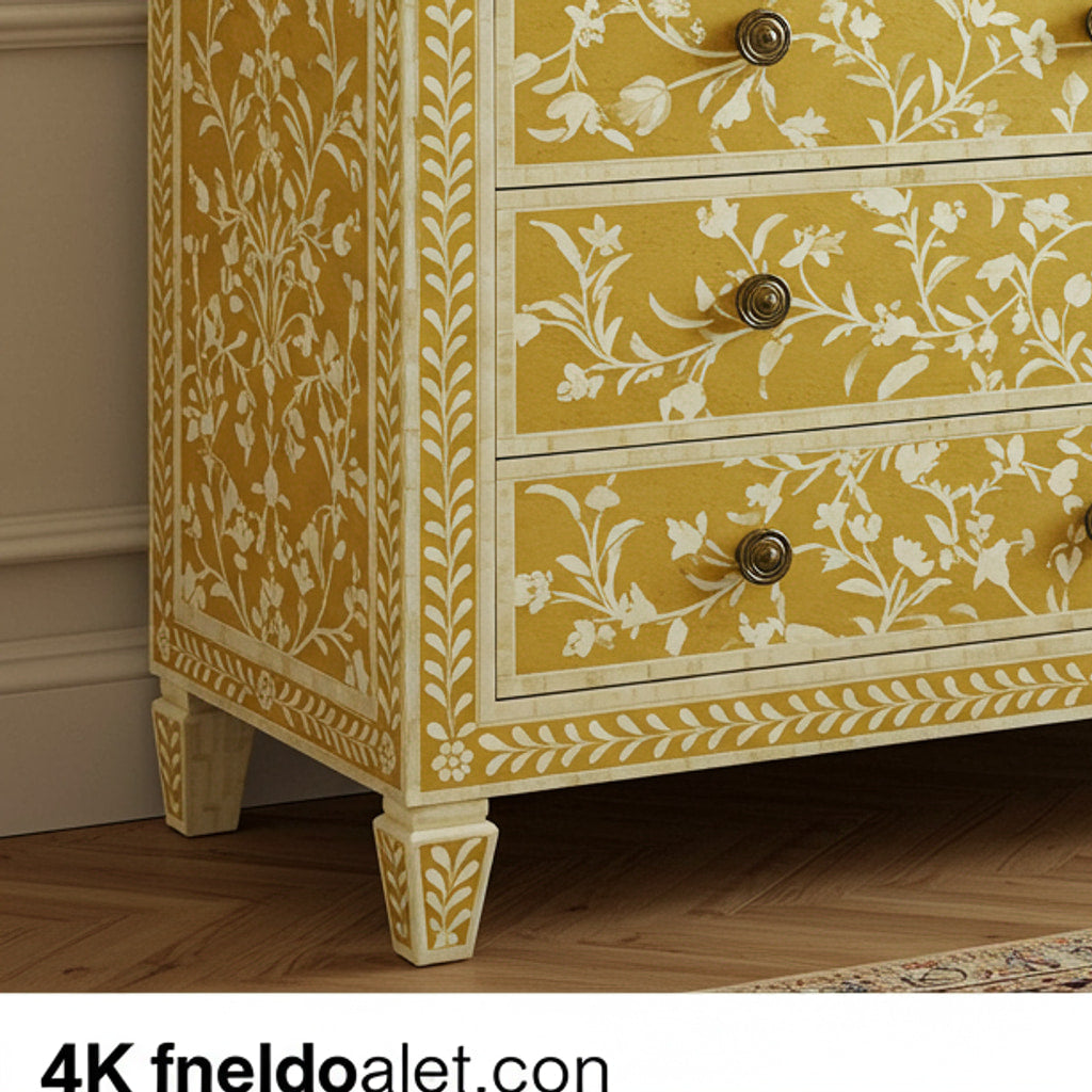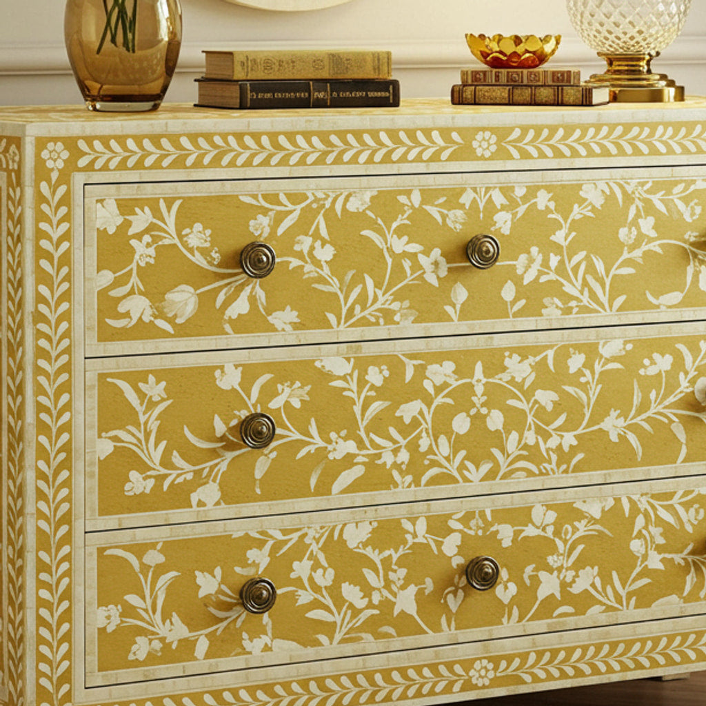 Elegant hand-painted floral wood dresser featuring three spacious drawers with brass knobs. The intricate white floral designs on a warm golden background add a touch of vintage charm to any room.