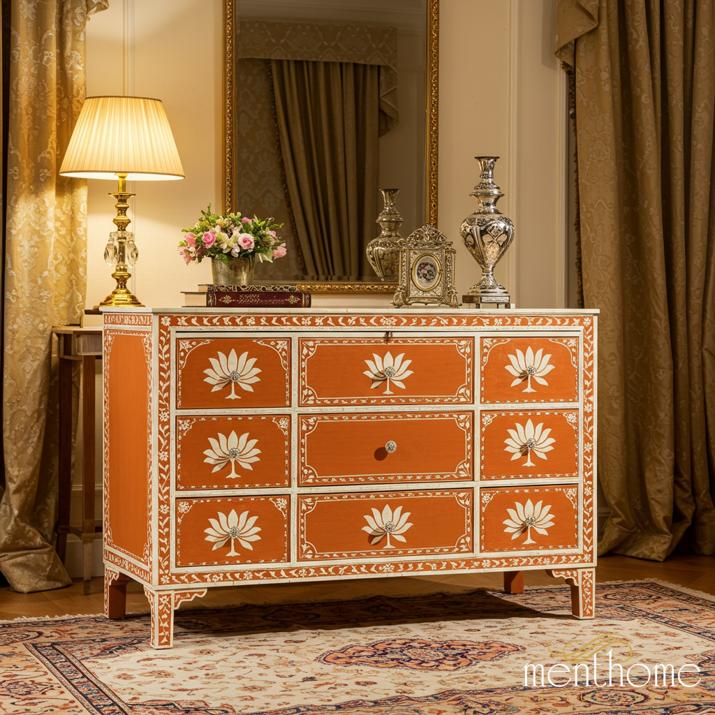 Elegant hand-painted wooden chest of drawers featuring a warm orange finish with intricate white floral patterns. Perfect for adding a classic and artistic touch to any living room or bedroom.