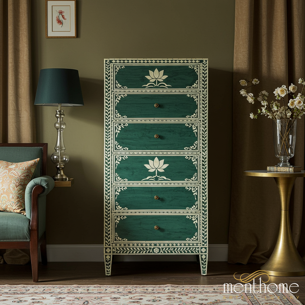 This elegant chest of drawers features a hand-painted green finish with intricate white floral and geometric patterns, offering both style and functionality. It has six spacious drawers with brass knobs, perfect for organizing clothes, linens, or accessories. Its vintage-inspired design complements traditional and contemporary home decor.