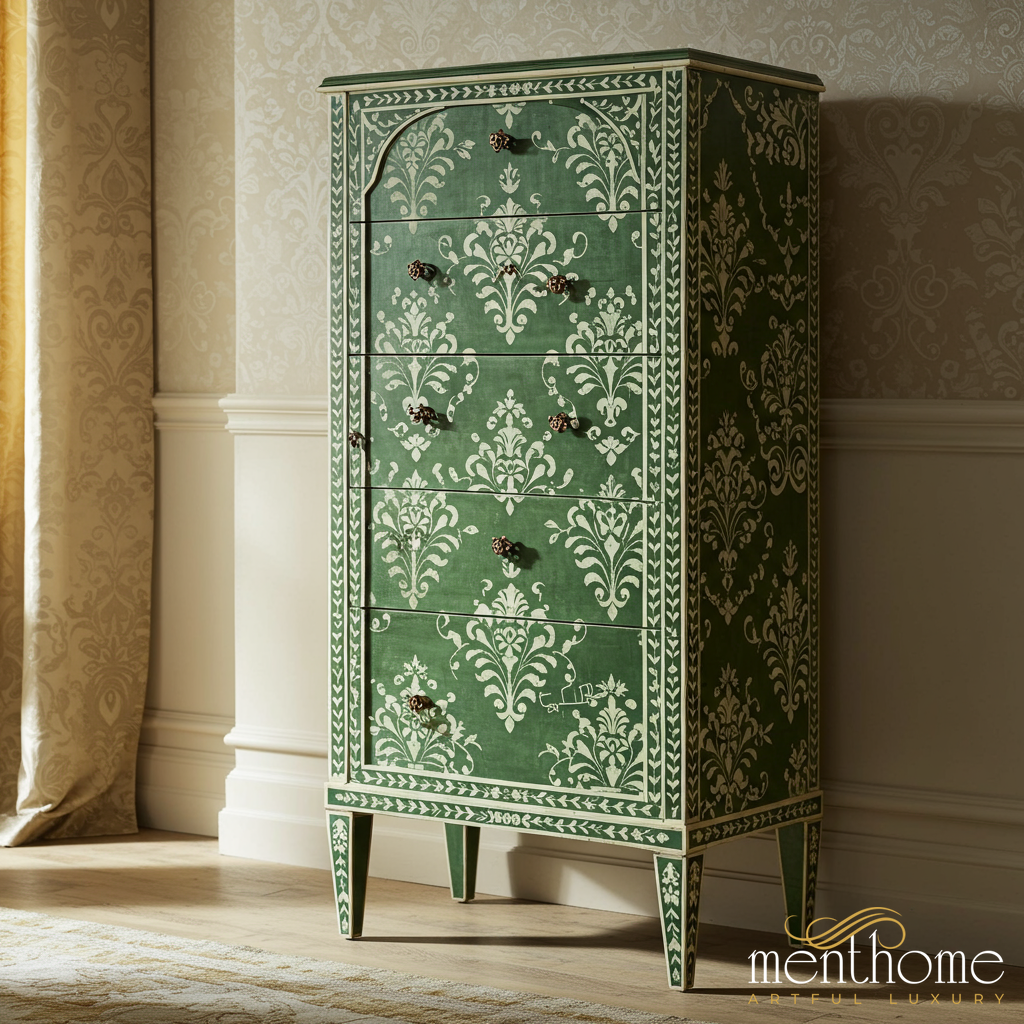 This elegant tall dresser features a striking hand-painted green finish with intricate floral patterns. Designed to bring a sophisticated and vintage charm to any room, it offers ample storage space with multiple drawers accented by decorative knobs.