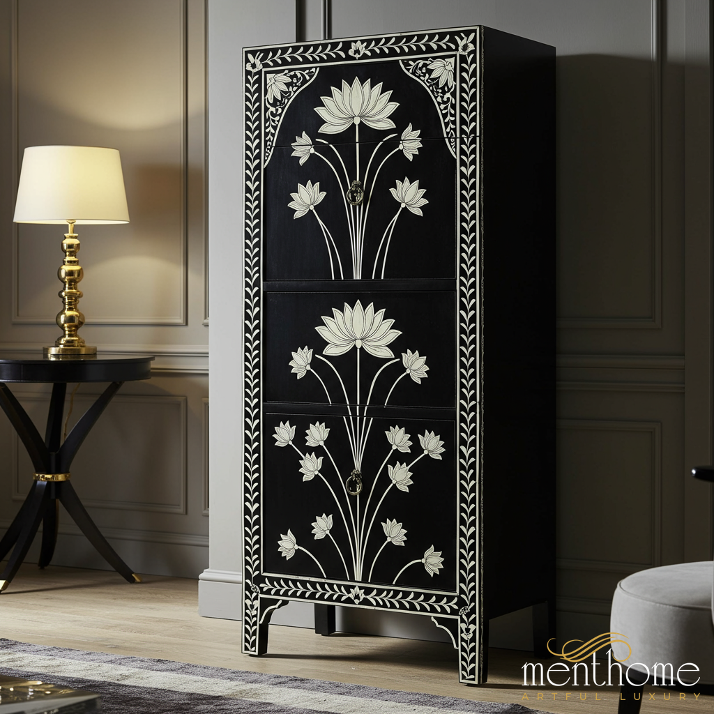 Handcrafted Black Floral Inlay Storage Cabinet | Luxury Handmade Tallboy
