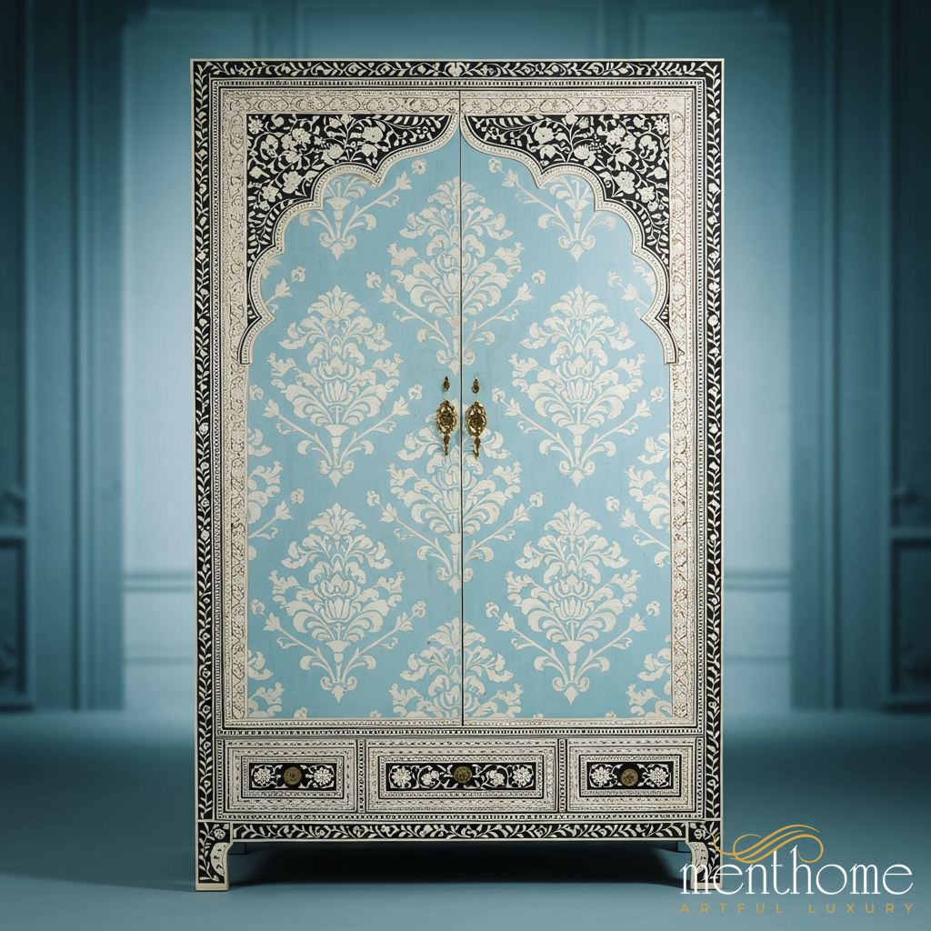 Handcrafted Blue and Ivory Inlay Wardrobe Cabinet | Luxury Handmade Wardrobe