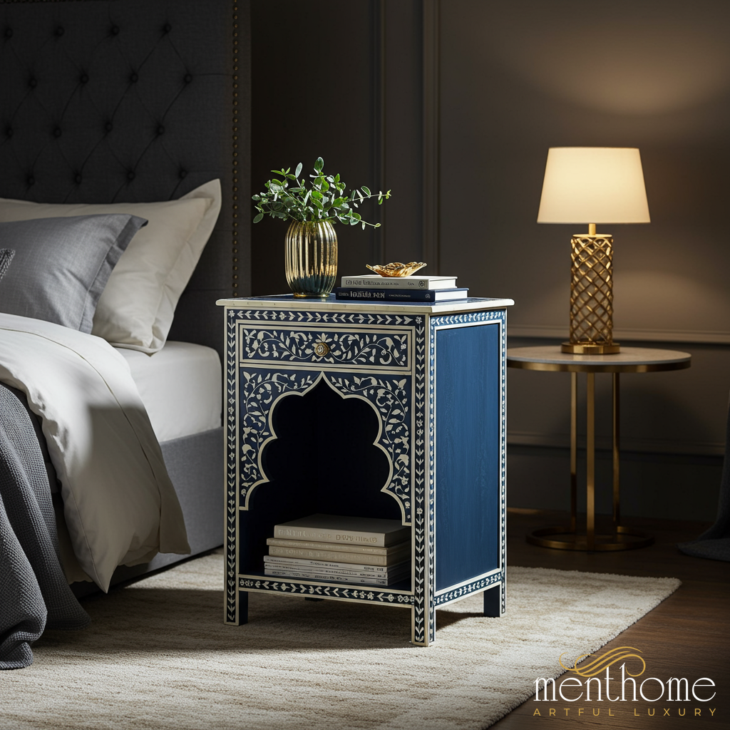 This exquisite handcrafted bedside table features intricate bone inlay work in a traditional floral and geometric pattern, highlighted in white against a deep blue background. Designed with a single drawer and an open lower shelf, it combines storage with style, perfect for keeping your nighttime essentials organized.