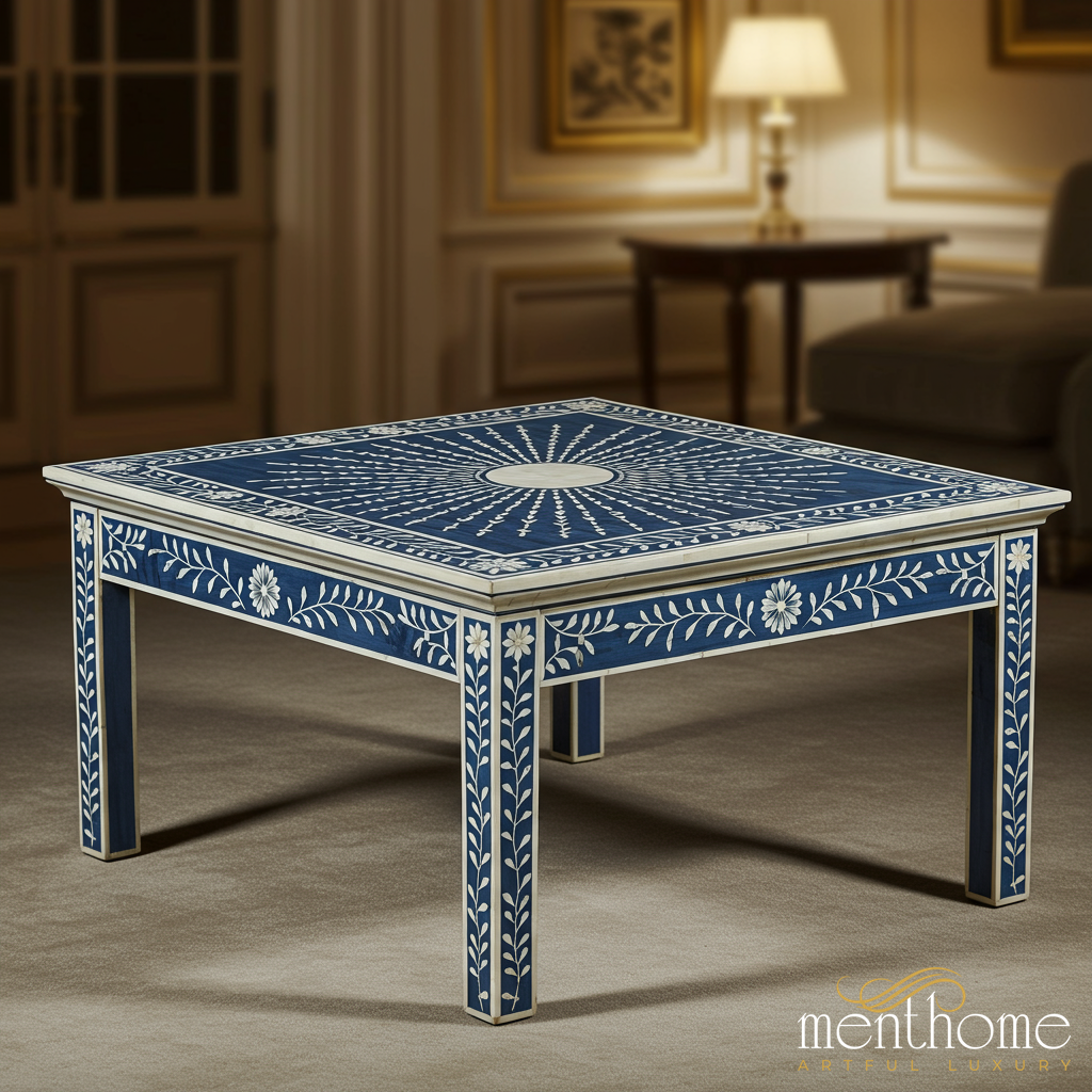 Handcrafted Blue and White Bone Inlay Coffee Table | Luxury Handmade Coffee Table