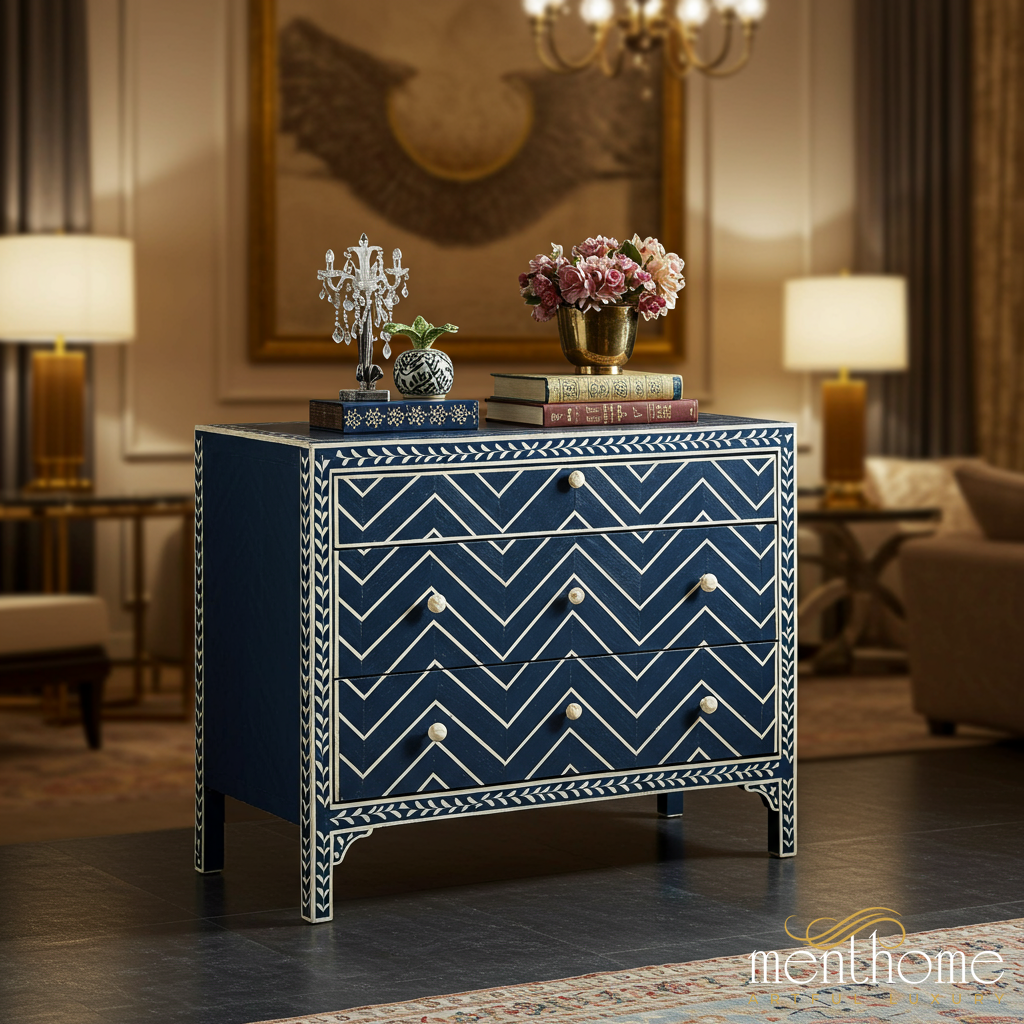 Elevate your living space with this elegant handcrafted chest of drawers featuring a striking blue and white chevron pattern. Perfect for storing essentials while adding a touch of sophistication to any room.