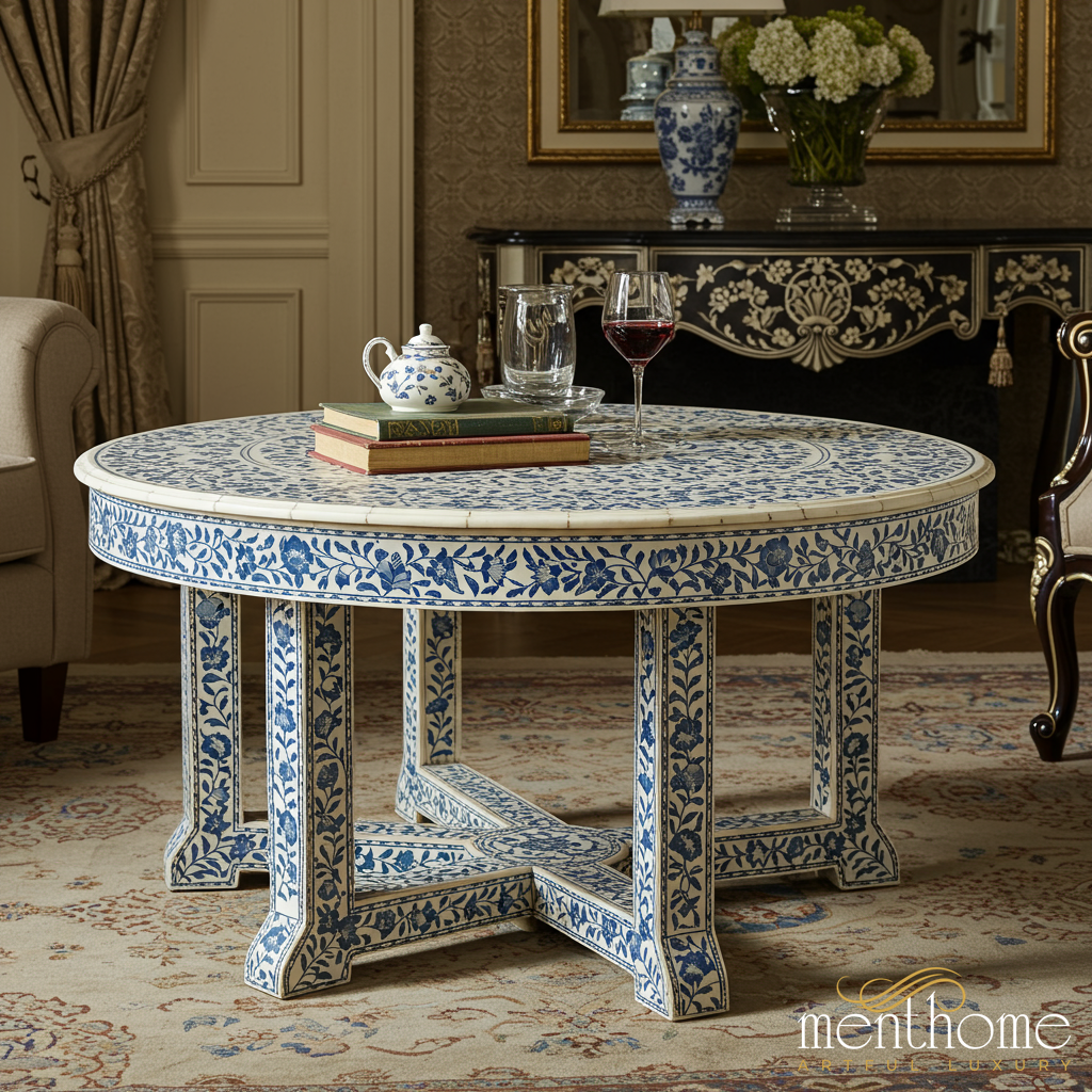 Handcrafted Blue and White Floral Inlay Coffee Table | Luxury Handmade Coffee Table