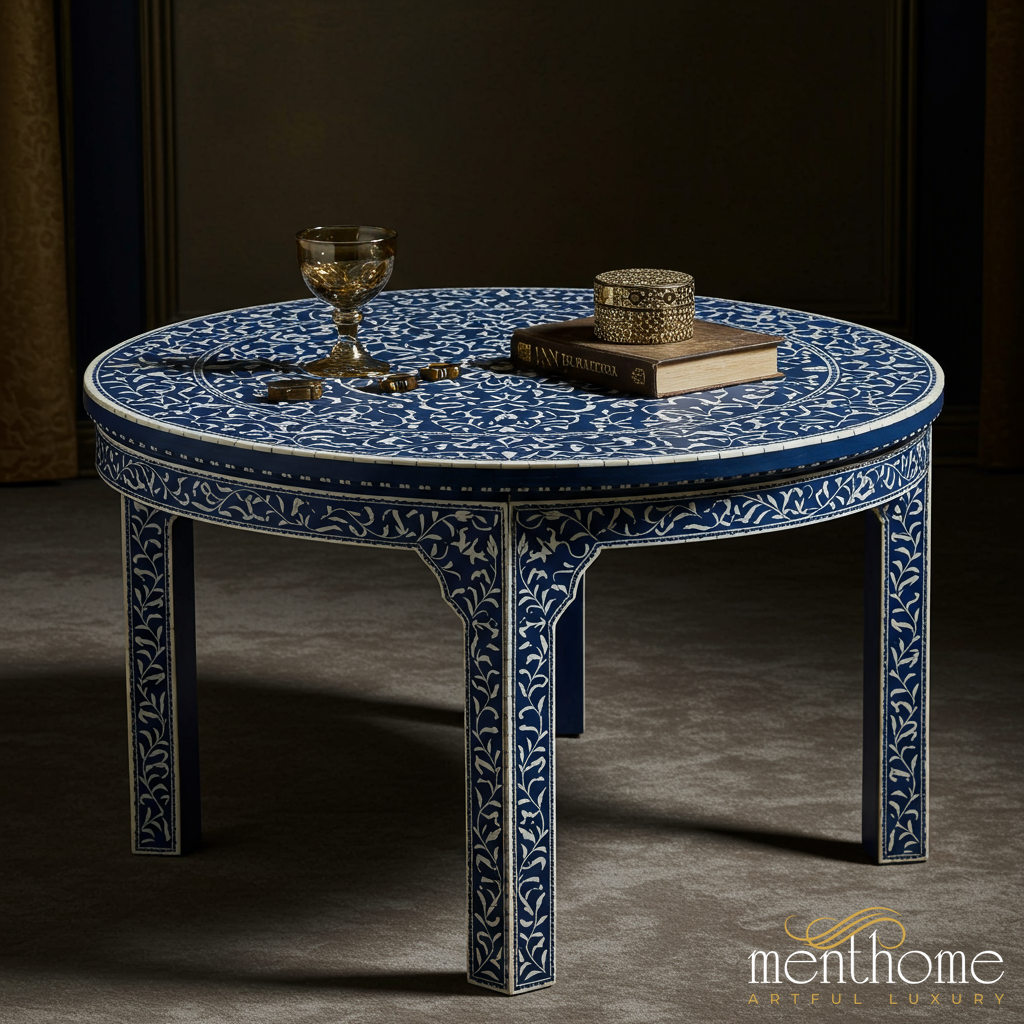 Handcrafted Blue and White Floral Inlay Round Coffee Table | Luxury Handmade Coffee Table