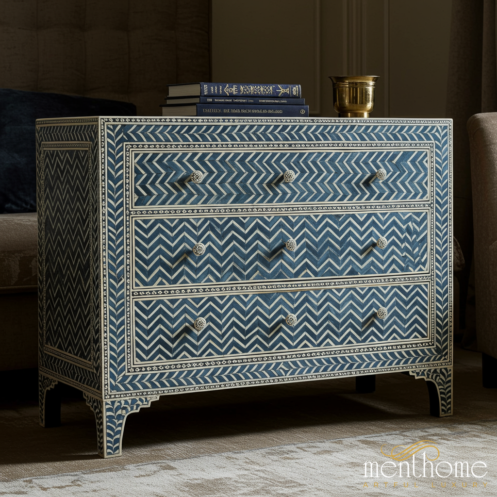 This beautifully handcrafted chest of drawers features a striking blue and white chevron bone inlay design. With three spacious drawers and intricately detailed patterns, it serves as both a functional storage solution and an exquisite decorative piece for any living room or bedroom.