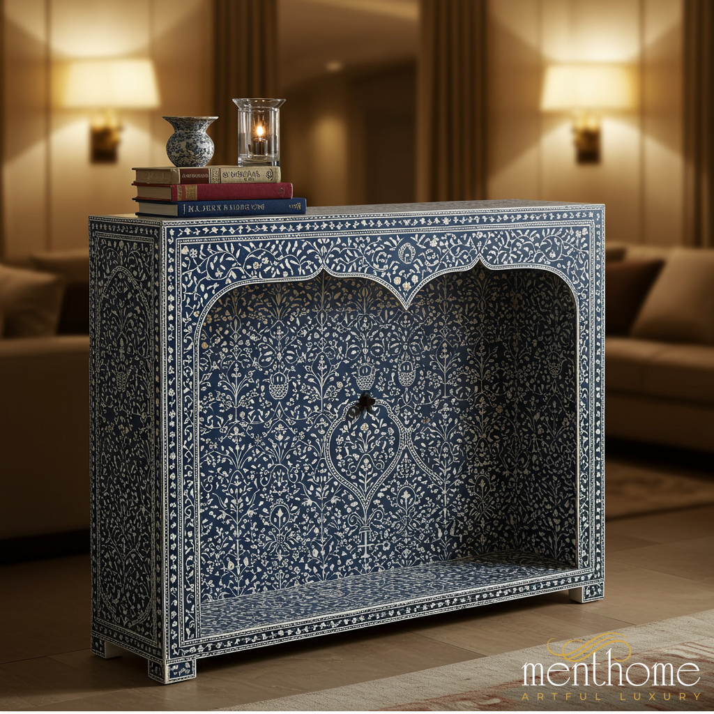 A beautifully handcrafted blue console table featuring intricate floral bone inlay designs. This elegant table adds a vintage and artistic touch to any living room or hallway. Made with precision and care, it blends artistry with practical storage space.