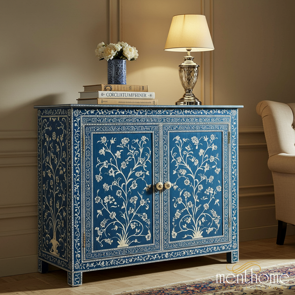 This exquisite handcrafted wooden cabinet features intricate white floral bone inlay on a deep blue background. Ideal for adding a touch of elegance and vintage charm to any living room, hallway, or bedroom. The cabinet provides ample storage space behind two doors and stands firmly on four legs. Perfect for organizing books, decorative items, or household essentials.