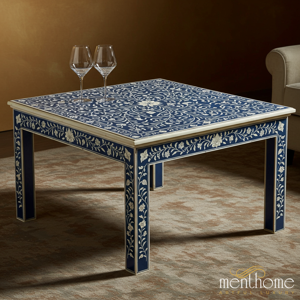 This elegant square coffee table features intricate floral inlay patterns on a deep blue background, showcasing exquisite craftsmanship. Perfect for adding a sophisticated touch to any living space.