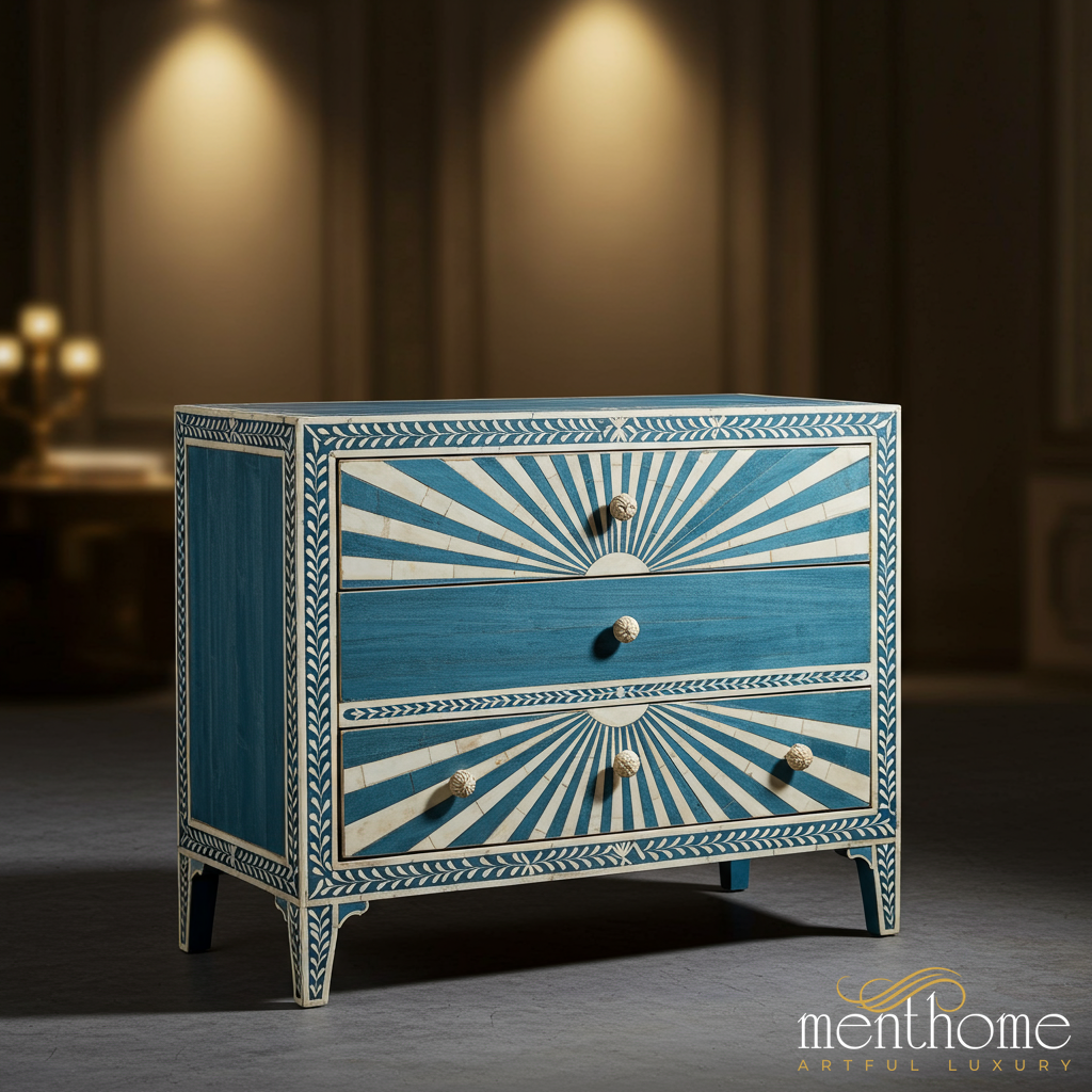 Handcrafted Blue Sunburst Pattern Wooden Chest of Drawers | Luxury Handmade Chest of Drawer