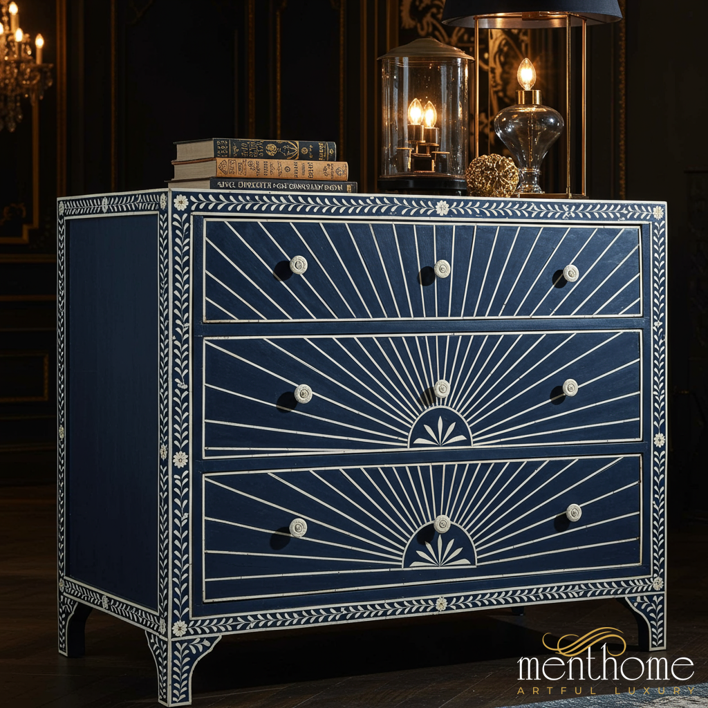 Handcrafted Blue Wood Chest of Drawers with White Inlay | Luxury Handmade Chest of Drawer