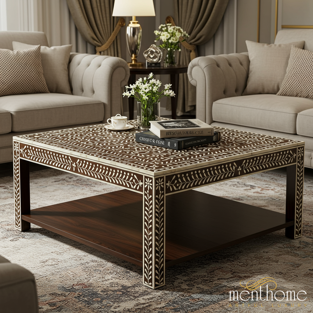 A beautifully handcrafted square coffee table featuring intricate bone inlay designs on a rich dark wood finish. This elegant piece offers both style and functionality with its spacious tabletop and lower shelf for additional storage.