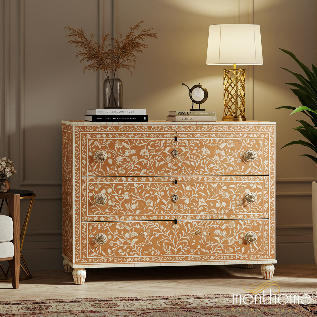 Handcrafted Bone Inlay Floral Pattern Chest of Drawers | Luxury Handmade Dresser
