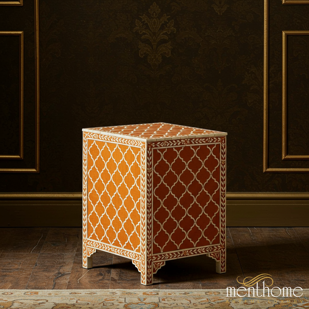 This elegant handcrafted side table features a distinct geometric bone inlay design on all sides, blending traditional craftsmanship with modern aesthetics. Each piece is meticulously crafted to add a touch of sophistication and cultural charm to any room.