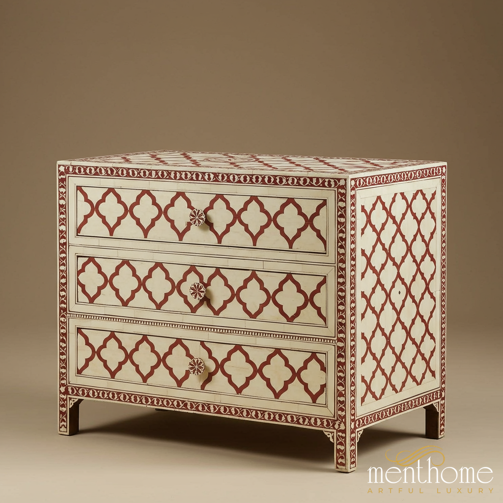 Elegant handcrafted chest featuring three spacious drawers adorned with intricate bone inlay patterns in a classic red and white design, perfect for adding a touch of traditional artistry to any room.