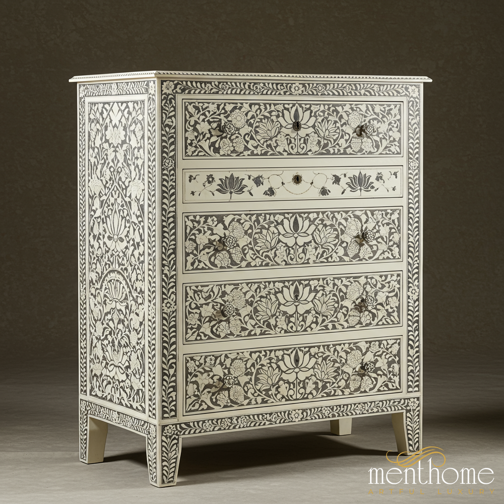 Handcrafted Floral Inlay Bone Chest of Drawers | Luxury Handmade Tallboy