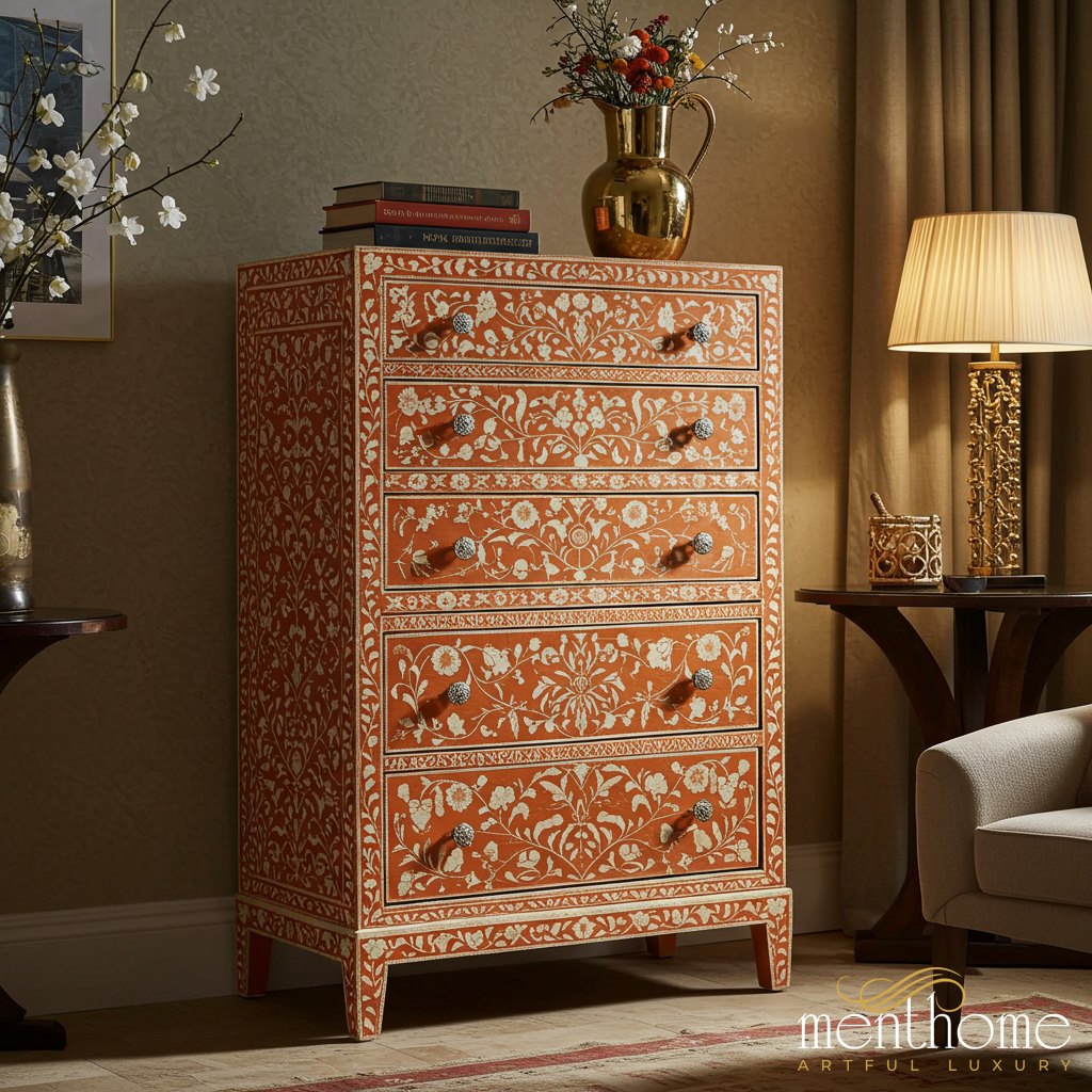This exquisite handcrafted chest of drawers features intricate floral inlay work on a warm terracotta base, offering an elegant and artistic storage solution for any living space. Each drawer is adorned with detailed patterns and decorative knobs, combining functionality with timeless craftsmanship.