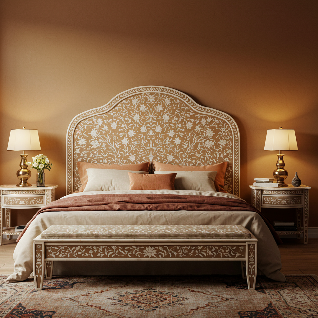 This exquisite king-sized bed features intricate floral inlay work on the headboard, bench, and matching nightstands, blending timeless craftsmanship with elegant design. Perfect for creating a luxurious and warm ambiance in your bedroom.