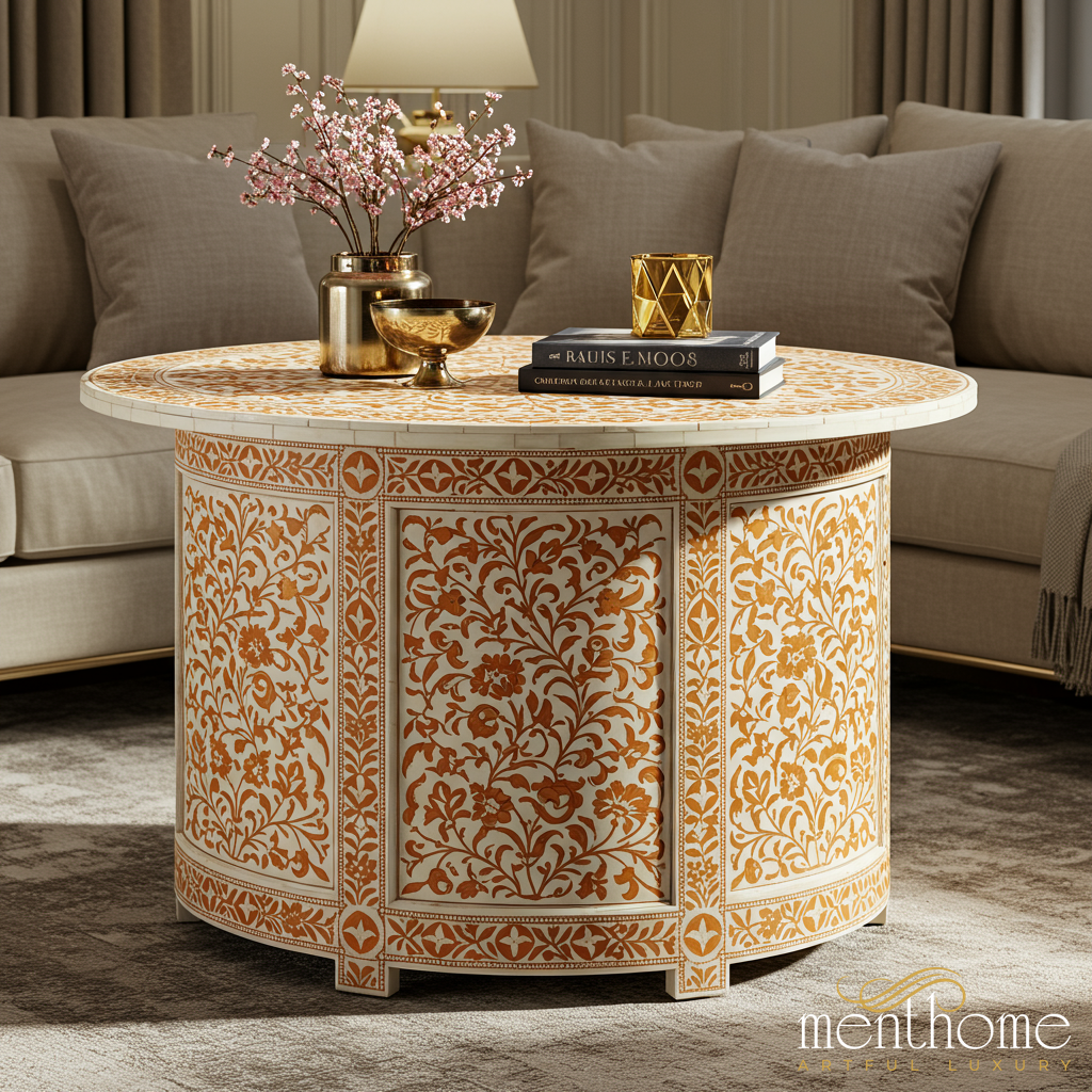 A beautifully handcrafted round coffee table featuring intricate floral inlay work in warm golden hues. This elegant piece blends traditional artistry with contemporary design, making it a perfect centerpiece for any living room.