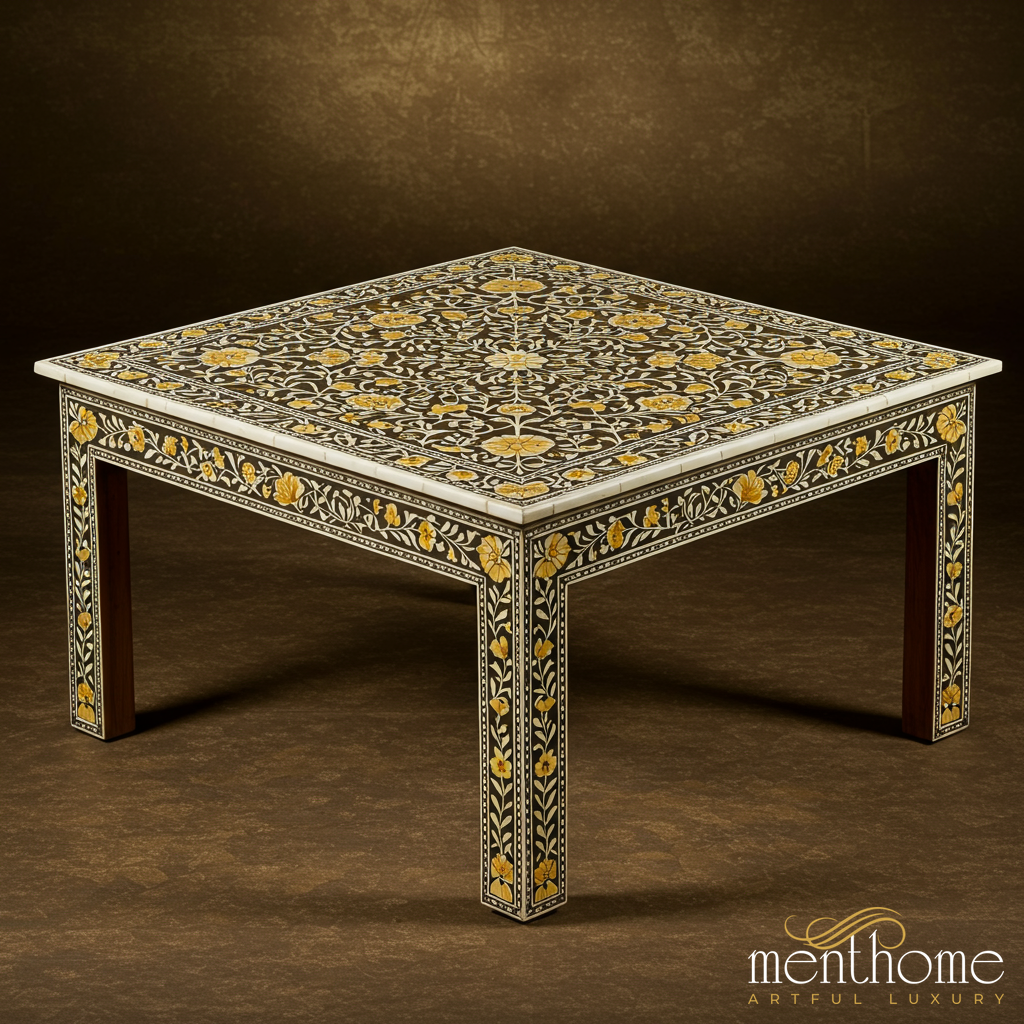 Handcrafted Floral Inlay Wooden Coffee Table | Luxury Handmade Coffee Table