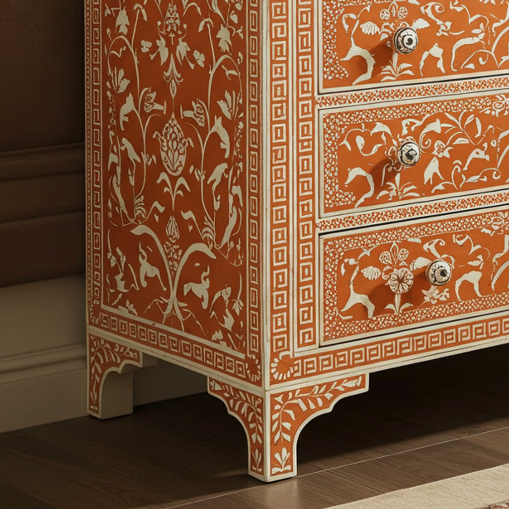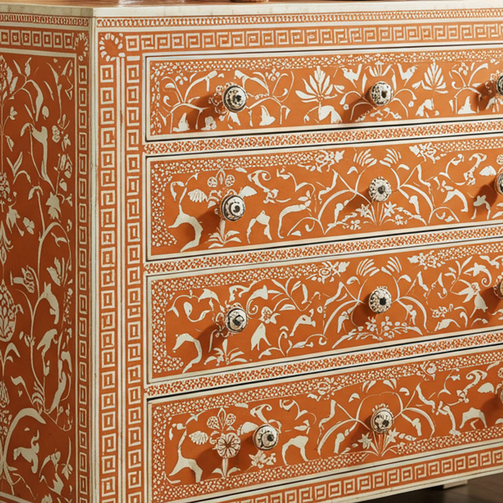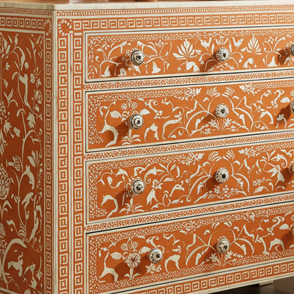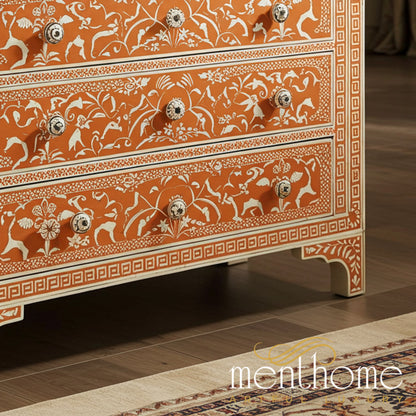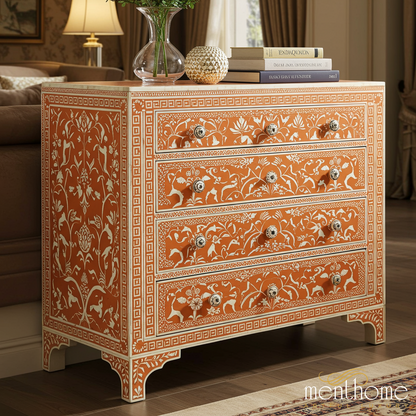 This elegant chest of drawers features a handcrafted bone inlay design with intricate floral and animal patterns on a warm terracotta background. The piece combines traditional craftsmanship with functional storage solutions, making it a perfect addition to living rooms, bedrooms, or hallways.