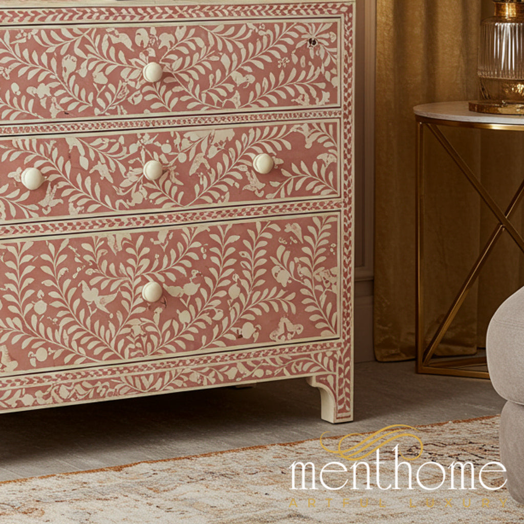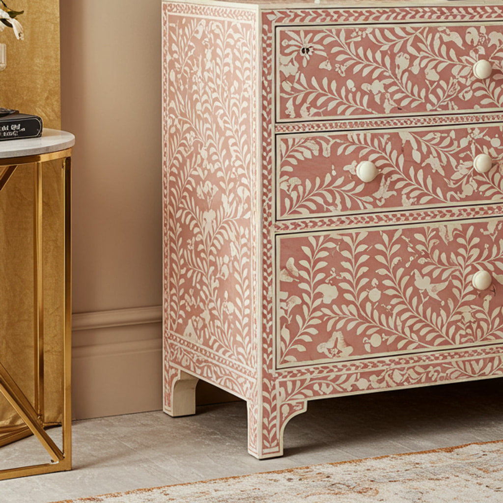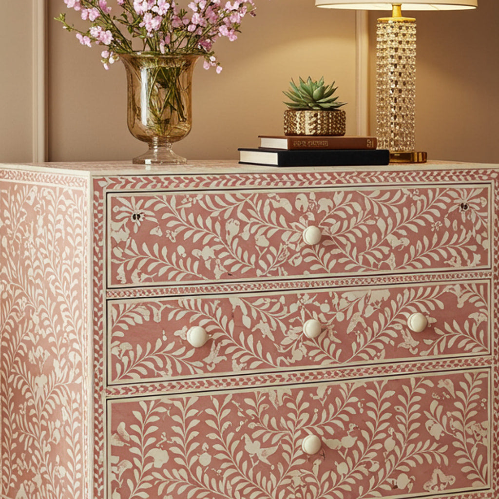 An elegant three-drawer chest featuring intricate floral wood inlay patterns in soft pink and ivory tones. Perfect for adding a touch of artisanal charm to any bedroom or living space.